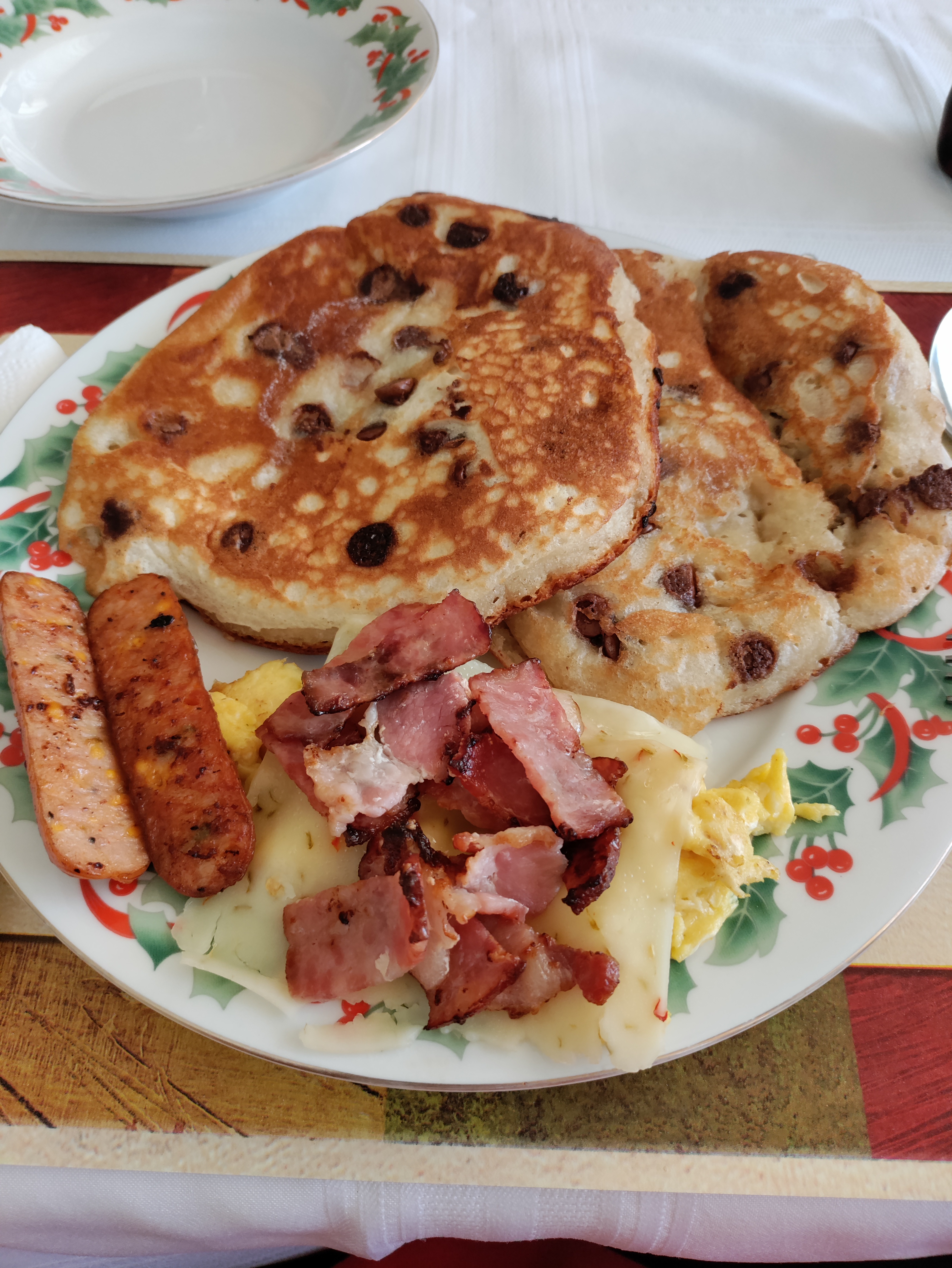 Cook for 3 minutes, until bubbles start to appear on the surface. If adding any toppings like chocolate chips or small fruit , sprinkle over the pancake. Flip the pancake over and cook for another 2 minutes, until golden brown. Repeat with the remaining batter.